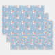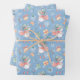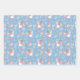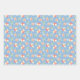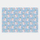 Adorable snowmen dressed in Holiday attire form a pattern with snowflakes, bells, and gift packages on two of the wrapping paper sheets in this set. The third has a pattern of brightly wrapped gift packages. All are placed on a coordinating blue background. Cute for kids of all ages!