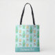 Summery pattern of soda pop drinks and beach umbrellas on teal personalised tote bag.