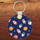 Blast off into a world of wonder with this adorable space-themed pattern perfect for little dreamers. Cheerful smiling planets in bright yellow, orange, pink, and peach float alongside red rockets zooming through the stars, cute floating astronauts, twinkling yellow stars, and constellation lines on a deep navy blue background. The playful, cartoon style and vibrant colors create a joyful, imaginative mood that's out of this world.