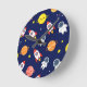 Blast off into a world of wonder with this adorable space-themed pattern perfect for little dreamers. Cheerful smiling planets in bright yellow, orange, pink, and peach float alongside red rockets zooming through the stars, cute floating astronauts, twinkling yellow stars, and constellation lines on a deep navy blue background. The playful, cartoon style and vibrant colors create a joyful, imaginative mood that's out of this world.