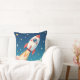 Cute red and white rocket blasting off in space with whimsical stars and clouds.