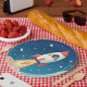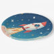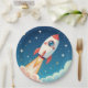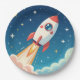 Cute red and white rocket blasting off in space with whimsical stars and clouds.