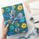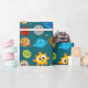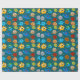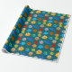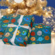 Wrapping paper with a cyan background featuring simple illustrations of suns, Earths, moons, stars, and planets with eyes. A fun and light design for kids' gifts and birthdays.