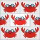 A happy bespectacled crab mascot with big eyes. He is posing with his big claws up in the air, but is very friendly and cute. His likes wearing big stylish eyeglasses because this gives him a unique look and style, so he might be a modern hipster crustacean.
