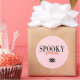 Shows "Spooky season" and a cute smiling black spider. The full-caps "Spooky" is black text, while the lowercase "season" is in orange script text. Optionally change the background colour.
