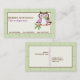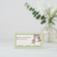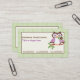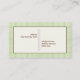Cute spring owl on a branch with green plaid border business cards, featuring a cute spring owl in purple and dark brown holding a flower in her beak (bill) on a branch with green leaves on green plaid border. An adorable, feminine, decorative design for owl lovers. Artwork by Trina Clark.