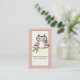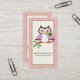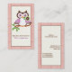 Cute spring owl on a branch with orange plaid border business cards, featuring a cute spring owl in purple and dark brown holding a flower in her beak (bill) on a branch with green leaves on orange plaid border. An adorable, feminine, decorative design for owl lovers. Artwork by Trina Clark.