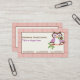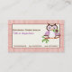 Cute spring owl on a branch with orange plaid border business cards, featuring a cute spring owl in purple and dark brown holding a flower in her beak (bill) on a branch with green leaves on orange plaid border. An adorable, feminine, decorative design for owl lovers. Artwork by Trina Clark.