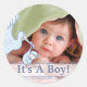 Baby Boy Blue Stork with a Baby Boy Bundle All Wrapped up and Ready for Delivery with Baby's Photo Front and Centre for the Whole World to See! Hello World from the sweetest little baby boy photo sticker ever.