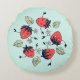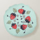 Cute strawberries kids pillow for girl with a vector illustration depicting 5 happy smiling strawberry characters dancing in a circle surrounded by leaves and flowers of their own kind. Fun design with a spring spirit for a person who loves these yummy fruits.