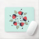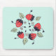 Cute strawberries mousepad with a vector illustration depicting 5 happy smiling strawberry characters dancing in a circle surrounded by leaves and flowers of their own kind. Fun design with a spring spirit for a person who loves these yummy fruits.