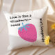 A bright pink strawberry with teal leaves and playful typography wraps around the design with the quote, “Love is like a strawberry—sweet.”