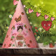 "Make the birthday girl feel extra special with this adorable personalised party hat, perfect for Michaela's 'Berry First' birthday celebration! This charming cone hat features a sweet little girl holding a basket of strawberries, accompanied by our whimsical snail carrying a strawberry and a delicate butterfly. 'Michaela's Berry First Birthday' is prominently displayed, making this hat a unique and memorable accessory for her big day.