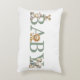 This custom baby nursery pillow features a sage green coloured, gender neutral theme with illustrations of cute little stuffed animals. The word "BABY" is printed in capital letters across the top portion. Animals stuffies accent the letter. A cow stuffy and mouse are placed on the left, with a lion cub in the centre. A baby elephant and duck are placed on the right.