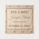 Personalised Cute Stuffed Animals themed design features a tan background to the phrase, "It's a Boy!" in brown lettering. Also in brown lettering is baby's name and due date. Design background features a pattern of an image of cute, cuddly stuffed animals all huddled together ready to welcome baby! Matches the "Cute Stuffed Animals" collection.