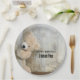 Birthday paper plates with a darling photograph of a cute stuffed bear, standing by a rustic wooden wall / backdrop.