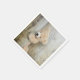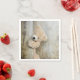 Paper napkins with a darling photograph of a cute stuffed bear, standing by a rustic wooden wall / backdrop.