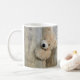 A mug with a darling photograph of a cute stuffed bear, standing by a rustic wooden wall / backdrop.