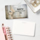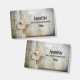 A name tag with a darling photograph of a cute stuffed bear, standing by a rustic wooden wall / backdrop.