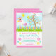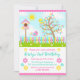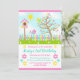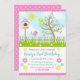 Cute Summer Garden design with colourful three, pink, blue and yellow flowers and birds with a birdhouse on a summer sky background and pink ribbon borders