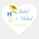 A cute way to decorate your wedding stationery, these heart shape stickers features a single sunflower inside of a mason jar. The mason jar has a blue bow tied around the neck. To the right of the image is a template for inserting the couple's name in blue cursive font. Underneath the design and couple's name is a template for inserting your wedding date in gold. Personalise your wedding stickers today!