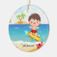 Personalise dated cute surfer boy Christmas Ornament set on a beach background. Visit our shop to view this adorable surfer girl in a variety of hair.