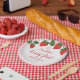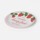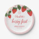 A cute strawberry 1st birthday party paper plates. Design features red strawberries, green vines and white flowers on a light pink background with a calligraphy script font.