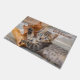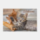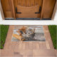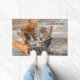 A young cute brown tabby kitten lying on stony ground and playing with a falling withered Platanus leaf. This doormat Welcome is a gift idea for cat lovers. A cute cat photo taken by Katho Menden in Greece.