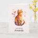Birthday card with an adorable watercolor illustration. An orange tabby cat looking friendly and happy with hearts swirling around.
