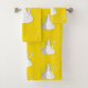Trendy Kitties Bath towel set with a yellow background with a white and grey Tabby Cats pattern. A cute addition to your bathroom decor with a kitties theme!