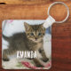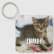 Personalised keychain with a funny photograph of a tabby cat. Hair on his back slightly raised and he has a surprised expression on his face. Cute and adorable. Makes you smile. :)