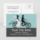 Cute Tandem Bike Bride And Groom Wedding save the date card featuring a bride in a wedding dress with a small red heart on the veil and a groom in his suit.. stunning custom wedding save the date postcards.. add your own text .. designer wedding products by Ricaso