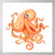 Cute pale tangerine octopus with bright blue eye and daisies for suckers. Original digital painting.