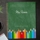 A modern personalised planner for teachers featuring a green chalkboard background with colourful coloured pencils. Teacher's Name in Script. Custom text at bottom in a serif font.