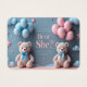 Celebrate your special moment with this adorable teddy bear gender reveal invitation. Featuring two fluffy teddy bears holding pastel blue and pink balloons, surrounded by dreamy clouds and stars. The elegant “He or She?” design makes it the perfect choice for baby shower parties, gender reveal events, or family celebrations. A modern, charming, and timeless design that will make your invitations unforgettable.