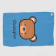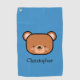 Cute brown teddy bear face with pink blushing cheeks pink ears and a happy face, on a blue background. A template below to add your name to personalise.