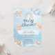 Cute baby shower invitations for baby boy featuring an adorable teddy bear, rainbow and clouds.