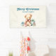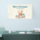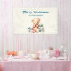 Christmas banner with a cute illustration featuring a Victorian style teddy bear. Wearing a fancy red bow. Drawn in a a cute old fashioned vintage style. Red and blue pastel Christmas presents surround this warm-hearted bear.
