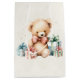 Gift bag with a cute illustration featuring a Victorian style teddy bear. Wearing a fancy red bow. Drawn in a a cute old fashioned vintage style. Red and blue pastel Christmas presents surround this warm-hearted bear.