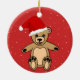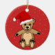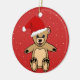 Cute Teddy Bear with Santa Hat Kids Red Ceramic Ornament. The background is red with white snowflakes.