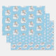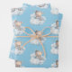 A set of three gift wrapping papers featuring a sweet teddy bear among clouds. Blue background. One of the papers has light blue stars. Perfect for kids, first birthday celebrations, baby showers, and welcoming a baby boy.