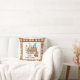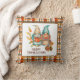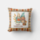 Cute Thanksgiving themed throw pillow features a pair of gnomes holding pumpkin and pie with Autumn coloured plaid background
