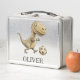 This irresistibly cute personalised lunch box features a funny whimsical T-Rex kicking a ball. Perfect for the little soccer fan in your life! Customise with your baby's name for a truly unique and personalised gift.