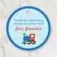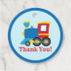 The favour tags are 2 sided. The first side features a red, yellow, and blue train engine and the words "Thank You". The second side has a small space for a message and the child's name.