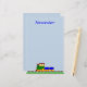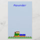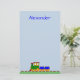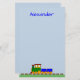 At the bottom of this kids' stationery, a cute train is on the railroad tracks. The light blue paper also has dark blue display text at the top for the boy's name. You can edit the black text to show the child's name.