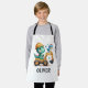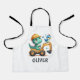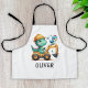 This personalised adorable kids' apron features a charming baby dinosaur joyfully driving a miniature construction vehicle. With its playful expression and vibrant colours, this delightful creation adds a touch of enchantment to any space, appealing to everyone, especially kids and babies.