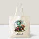 This personalised adorable, whimsical tote bag features a charming little dinosaur joyfully driving a miniature red tractor carrying flowers.