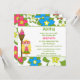 This 5.25x5.25 girl's birthday party invitation has a tropical luau hula girl design. The background is filled with pink, blue and white flowers. There is a blonde hair girl standing next to a tiki torch. You can easily customise your party information on the right side.