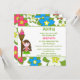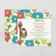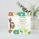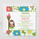 This 5.25x5.25 girl's birthday party invitation has a tropical luau hula girl design. The background is filled with pink, blue and white flowers. There is a brown hair girl standing next to a tiki torch. You can easily customise your party information on the right side.