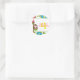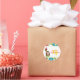 This girl's birthday party sticker has a tropical luau hula girl design. The border is filled with pink, blue and white flowers. There is a brown hair girl standing next to a tiki torch. You can easily customise your party information on the right side.